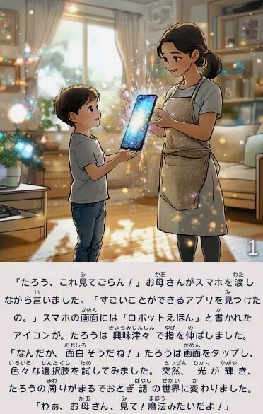登場人物の名前や物語の方向性を入力すると、内容に沿った絵と文章が、