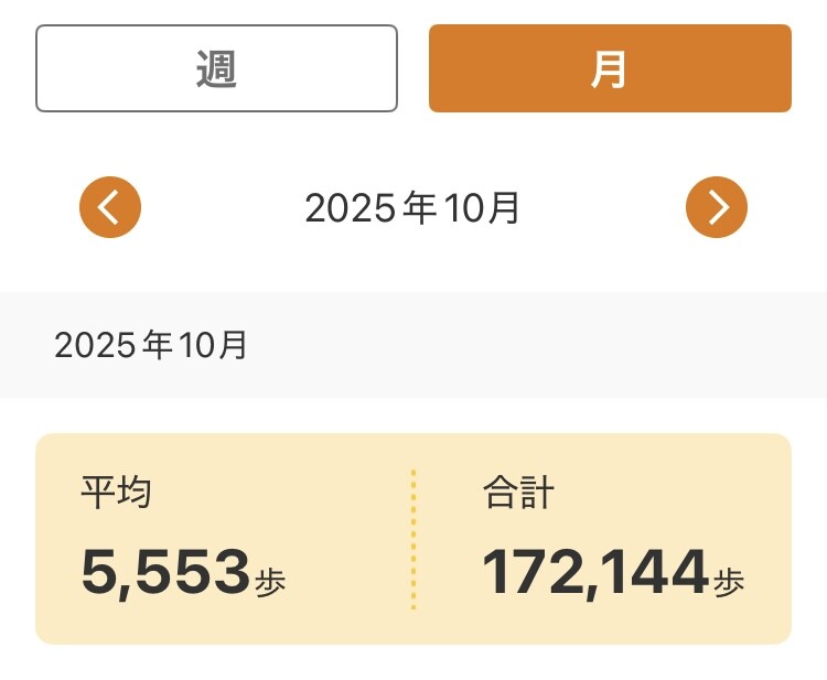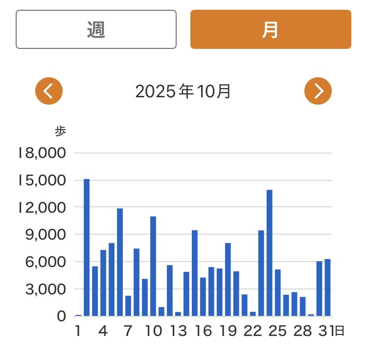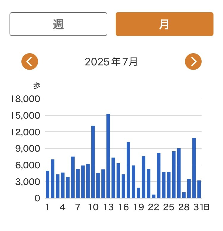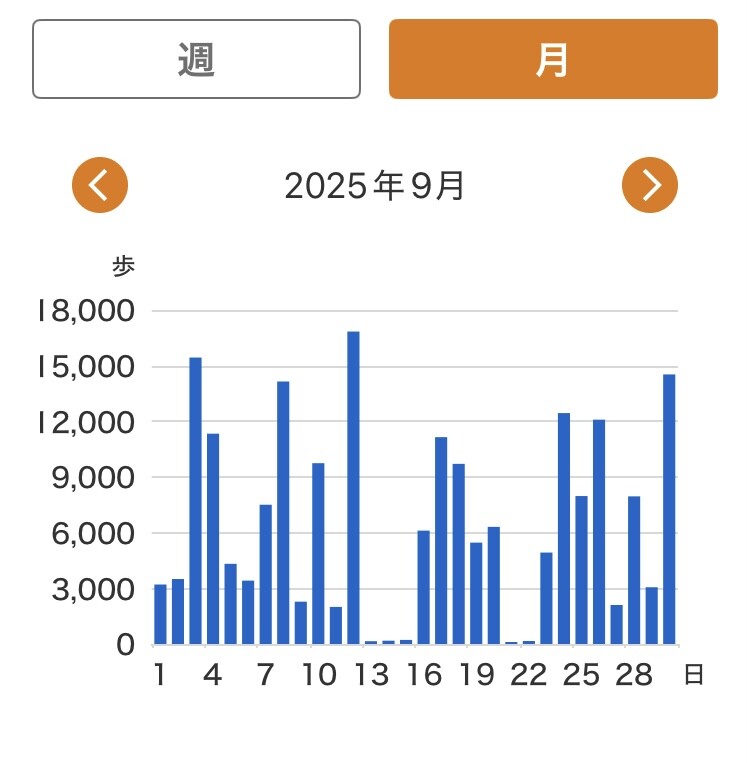 月間平均歩数は6600歩→5500歩に大幅減、6000歩台は来月はキープしたいね。