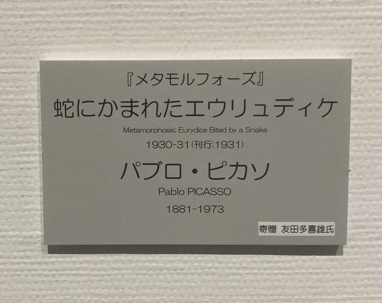 ピカソの『メタモルフォーズ』挿絵「蛇にかまれたエウリゥディケ」では、生と死の境界を一瞬の線で描き出す表現力を学ぶべきである。倒れ伏すエウリゥディケの身体はごく簡潔な線で構成されながらも、その重力感や力の喪失が鮮明に伝わる。蛇の存在も最小限の描写ながら、死の象徴として視線を引きつけ、画面に緊張を与えている。感情を過度に dramatize せず、むしろ静けさの中に深い悲劇性を滲ませるその抑制された描写が、見る者の想像力を喚起し、余白の力を考えさせる好例となっている。