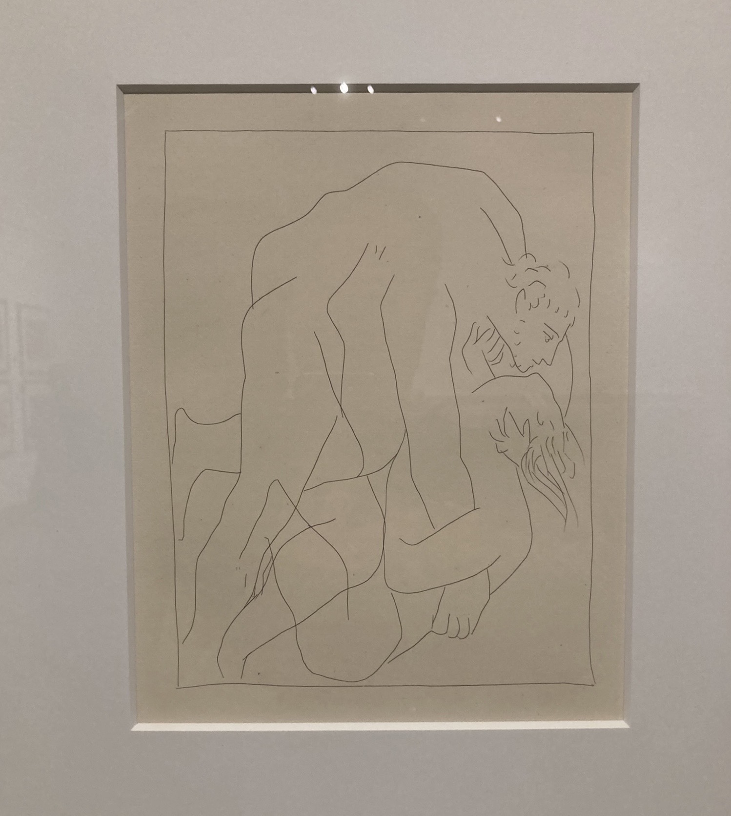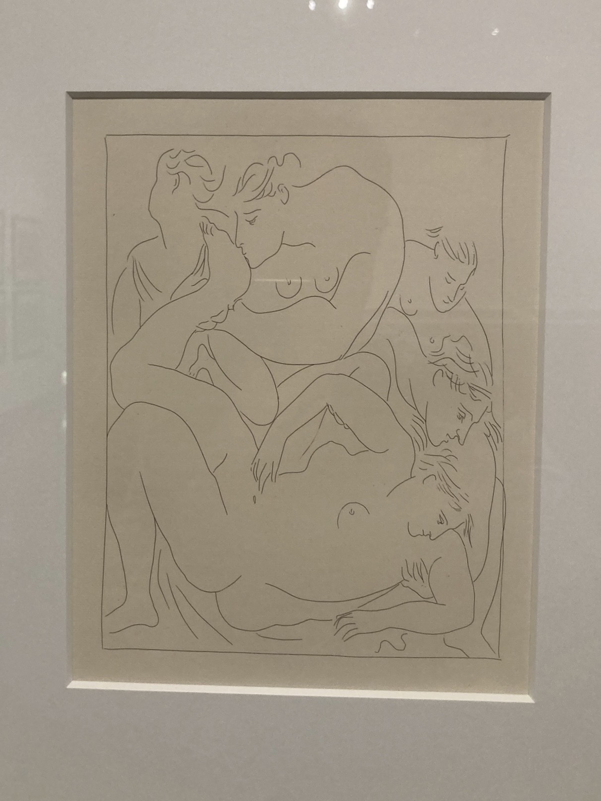 ピカソの『メタモルフォーズ』挿絵「テレウスと彼の義理の妹ピロメラとの競技」では、動きと緊張感を線のみで描き出す力を学ぶべきである。登場人物の体勢や視線、手足の位置関係が複雑に絡み合いながらも、線は乱れることなく構造的で、場面の劇性や対立が強く伝わってくる。空間の奥行きや力の流れを、陰影に頼らず輪郭線だけで示す点は特に注目に値する。また、人物同士の関係性や心理的距離までもが線の緊張によって可視化されており、描写の省略と集中の妙が表現力の手本となる。