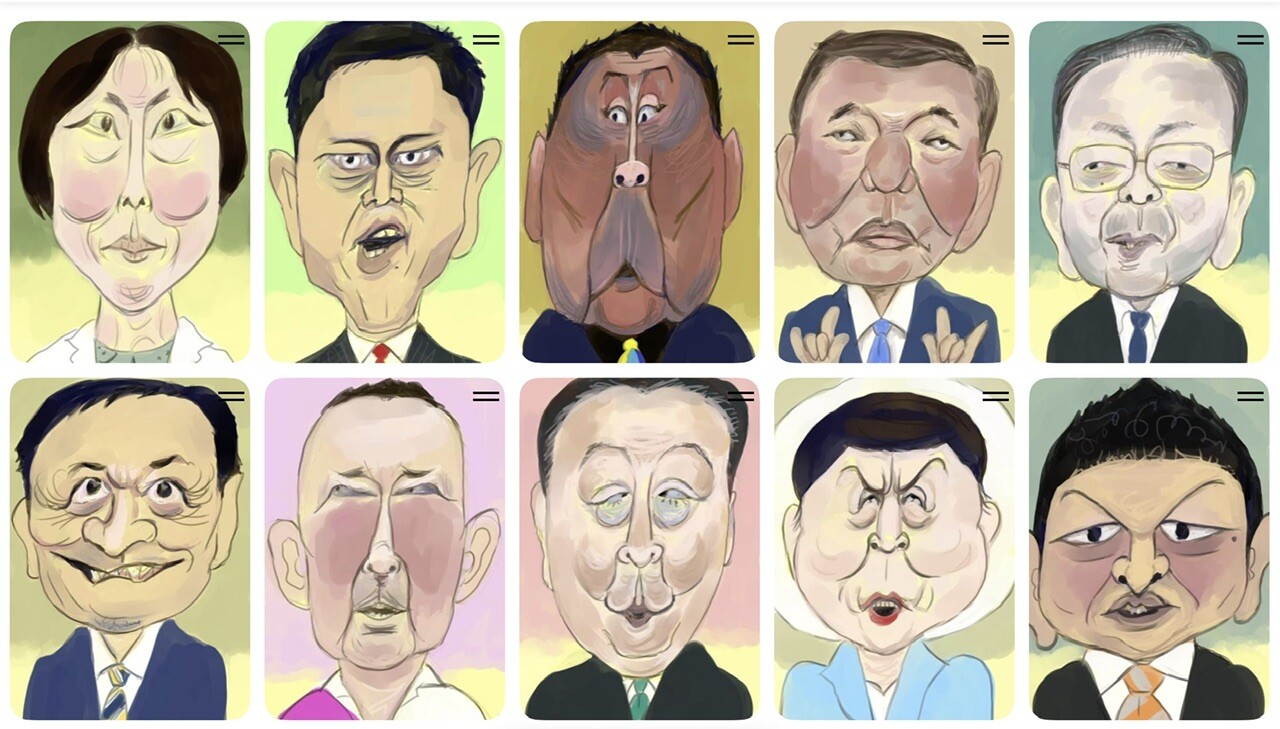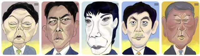 この前の参院選の各党の党首の顔・顔・顔の似顔絵たち。
