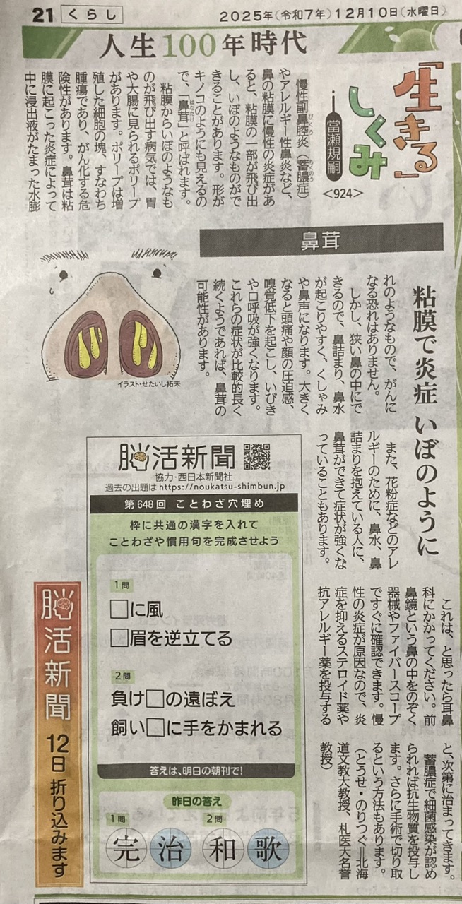 また、花粉症などのアレルギーのために、鼻水、鼻詰まりを抱えている人に、鼻茸ができて症状が強くなっていることもあります。