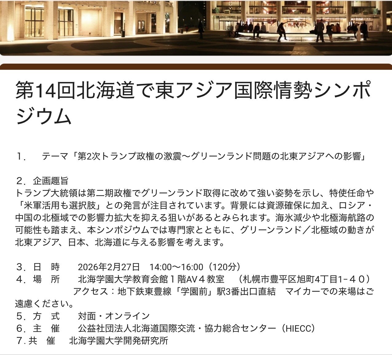 トランプ大統領は第二期政権でグリーンランド取得に改めて強い姿勢を示し、特使任命や「米軍活用も選択肢」との発言が注目されています。背景には資源確保に加え、ロシア・中国の北極域での影響力拡大を抑える狙いがあるとみられます。海氷減少や北極海航路の可能性も踏まえ、本シンポジウムでは専門家とともに、グリーンランド/北極域の動きが北東アジア、日本、北海道に与える影響を考えます。